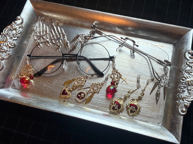 メガネの端につけるメタルチャームです。 メガネチェーンと同様のゴム製の金具を使用しており、つるのところから通して着用する形になります。左右セットです。