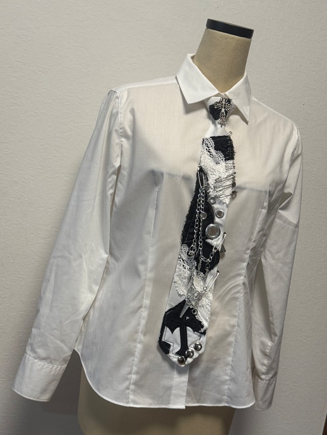 退廃的なリメイクネクタイです。 ネクタイは元々結ばれた形でアジャスターのような紐で調整するタイプです。男女問わずフリーサイズになります。