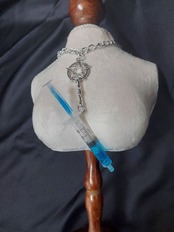 青い注射器のネックレスです。