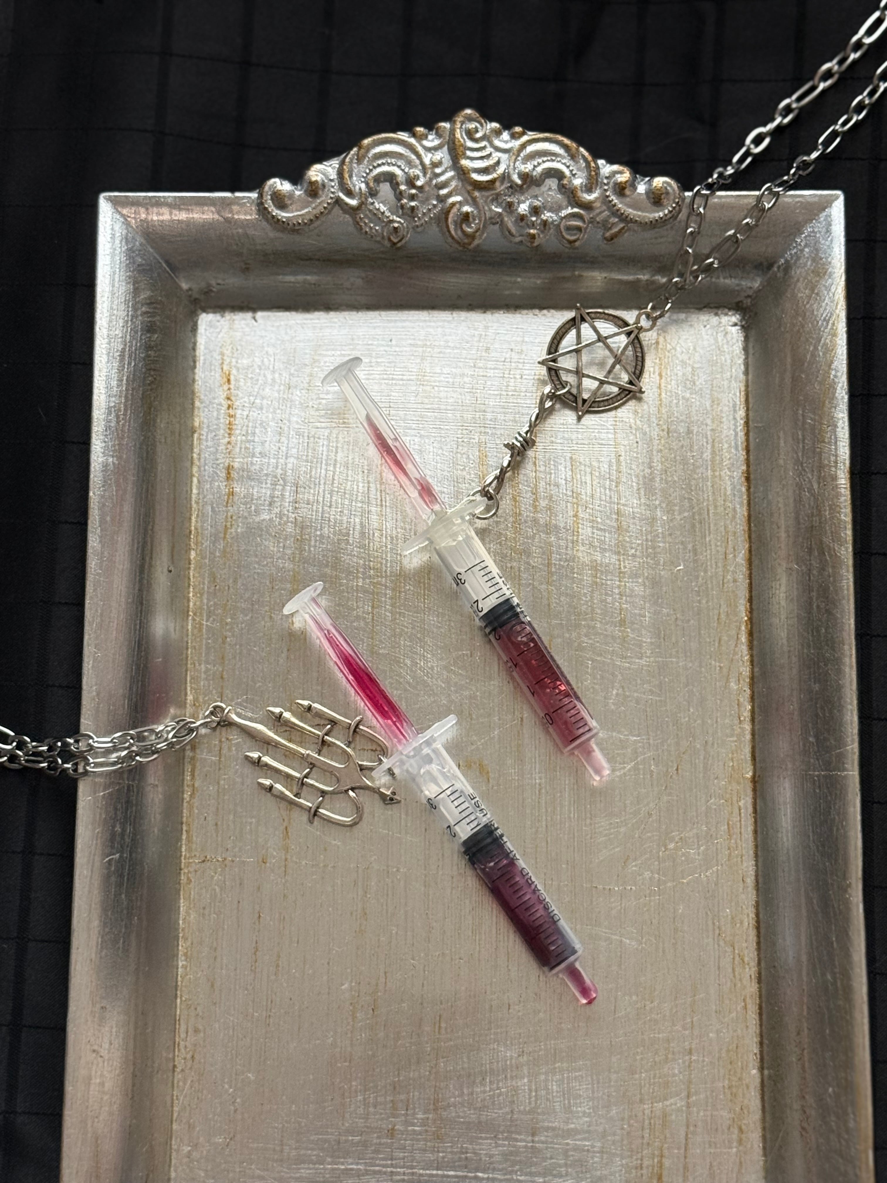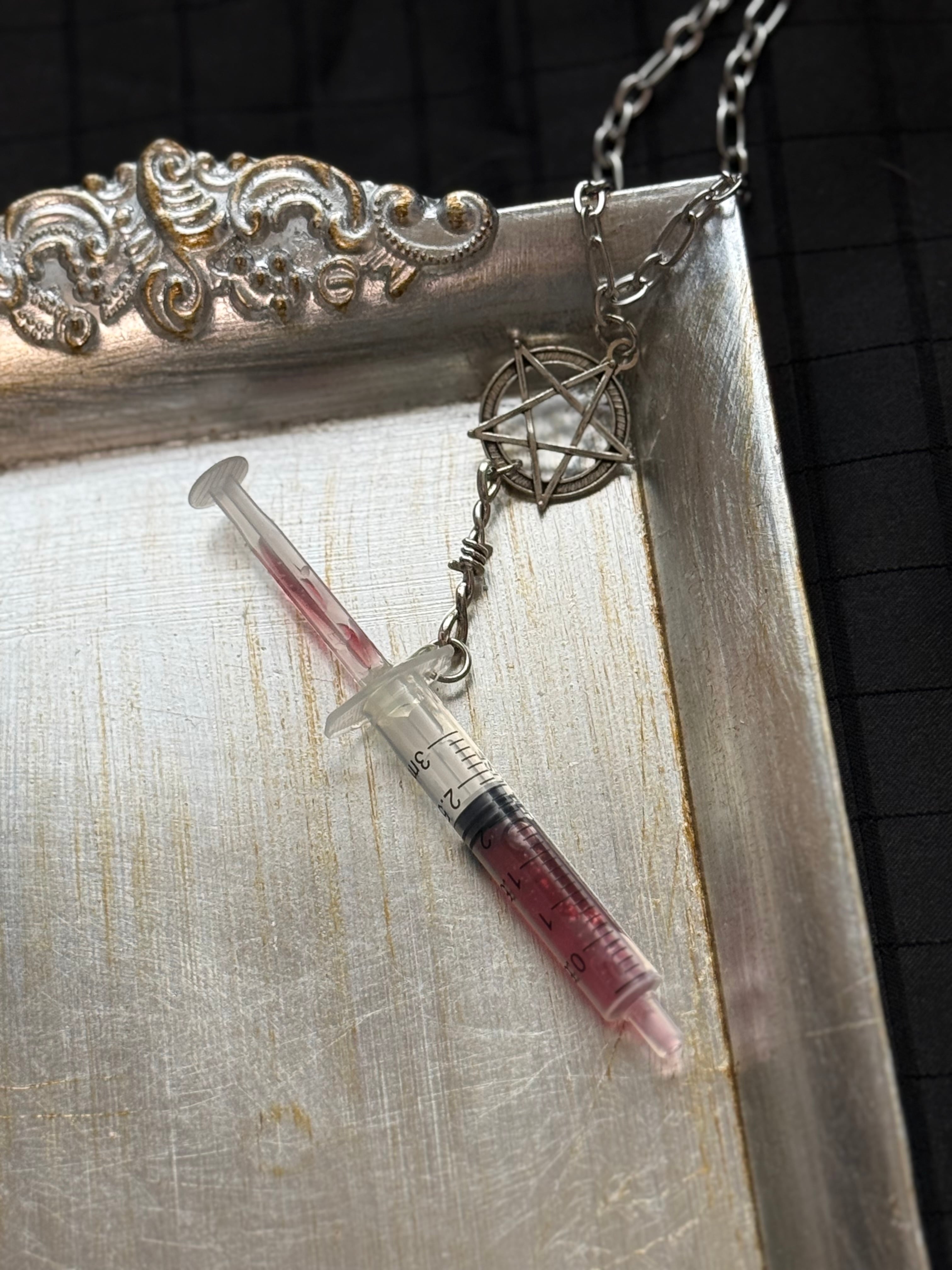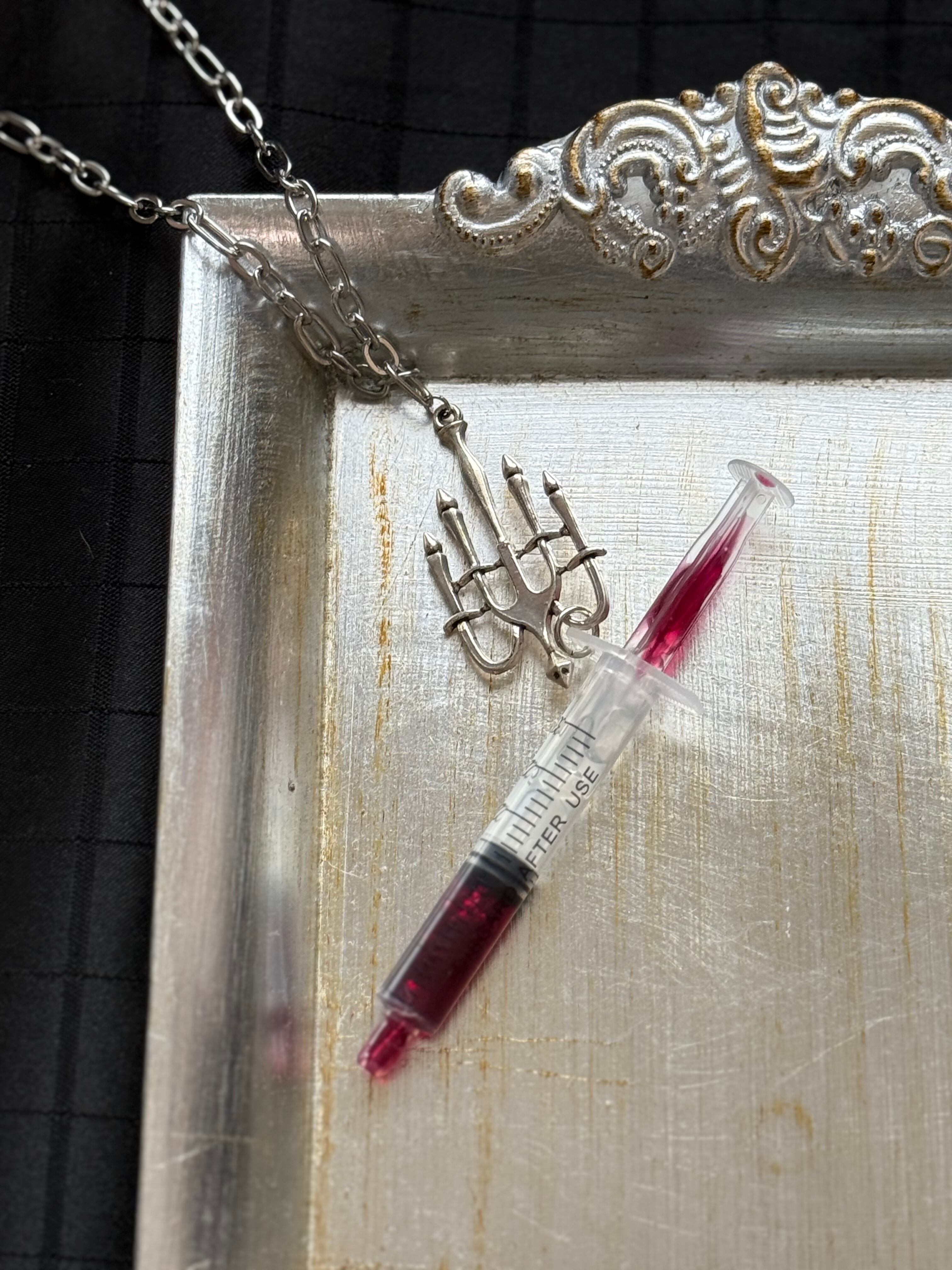 赤い注射器のネックレスです。