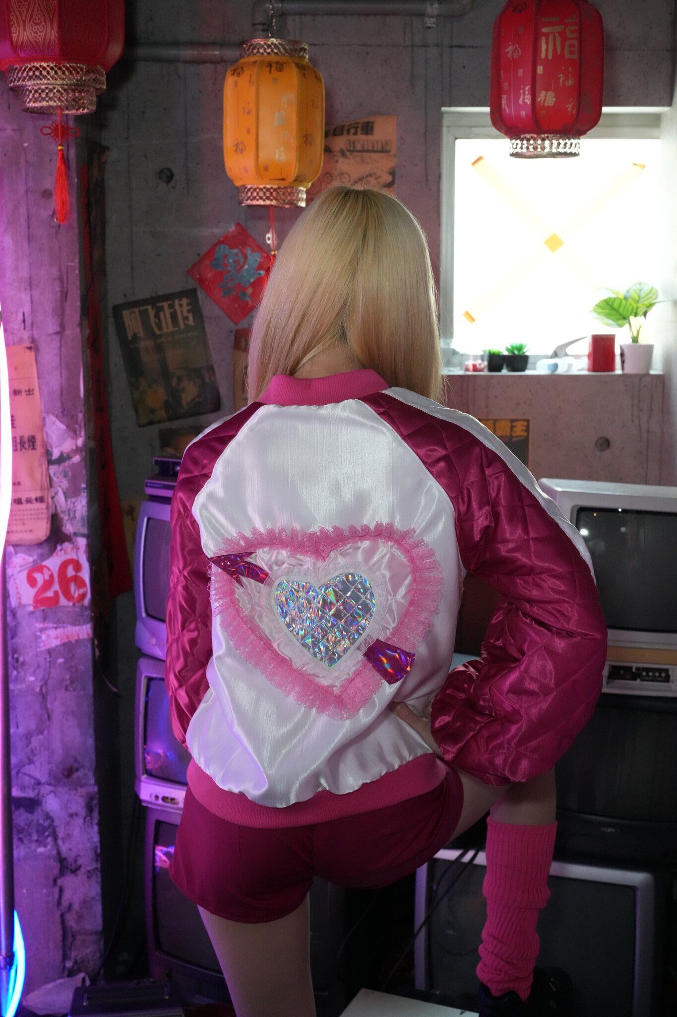 他にあまり見ないポップなデザインで、袖は手作業でキルティングしています。キルティングのため結構暖かいです。背面にも柄が入っています。