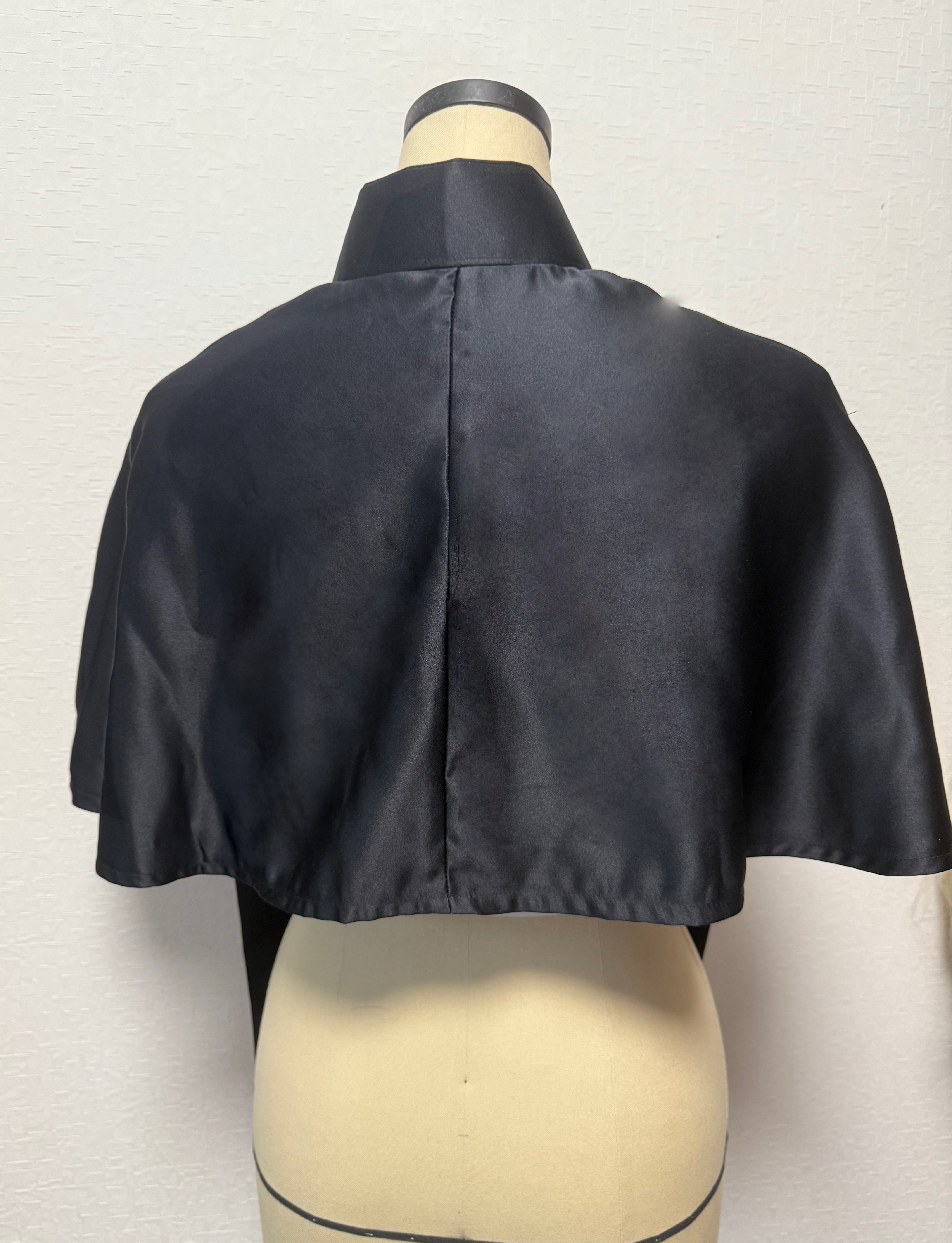 高いスタンドカラーに立体的な十字架が高級感があります。