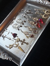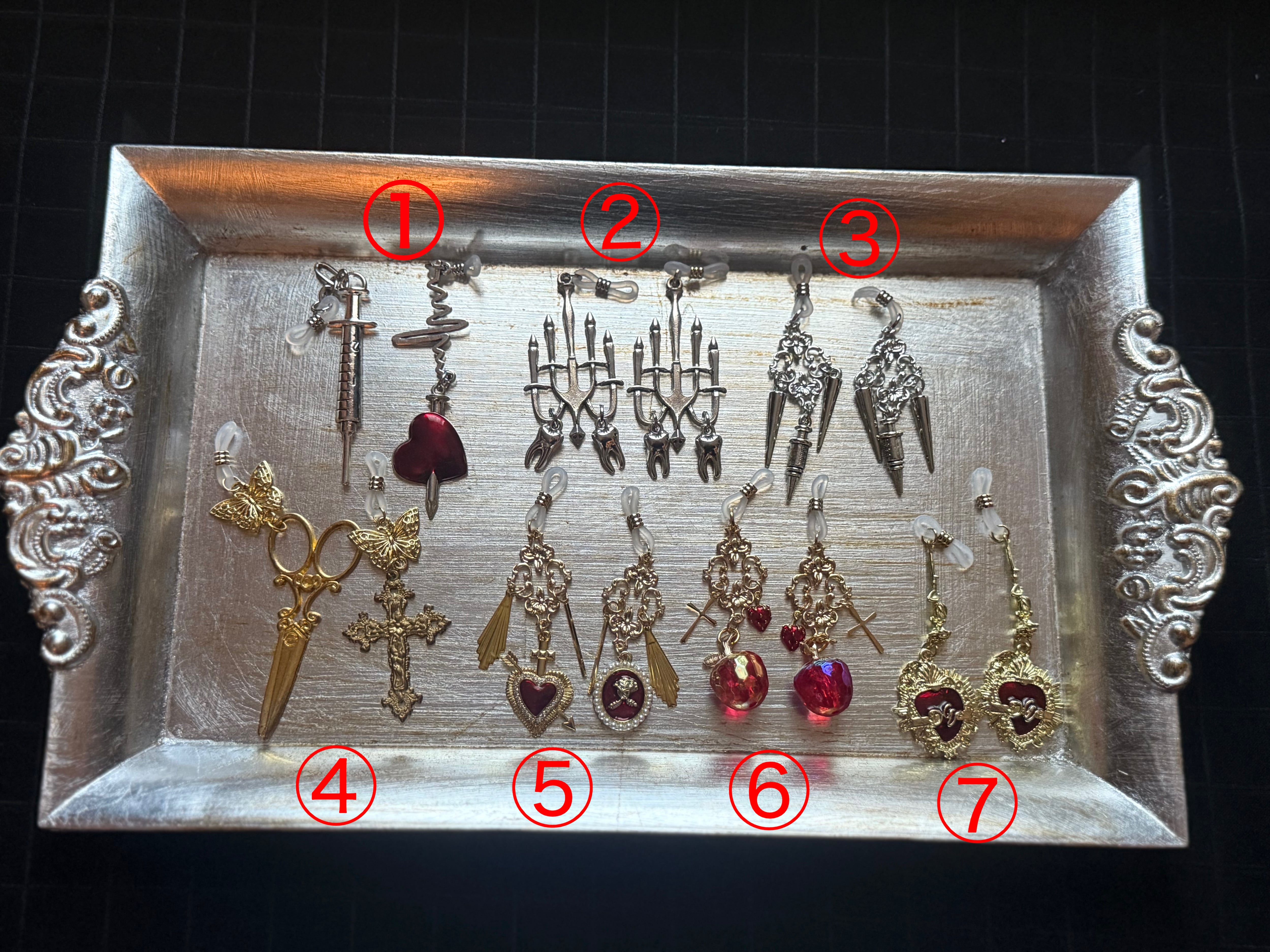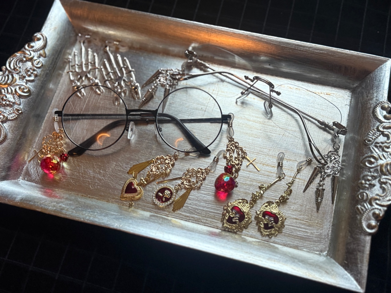 メガネチェーンと同様のゴム製の金具を使用しており、つるのところから通して着用する形になります。左右セットです。