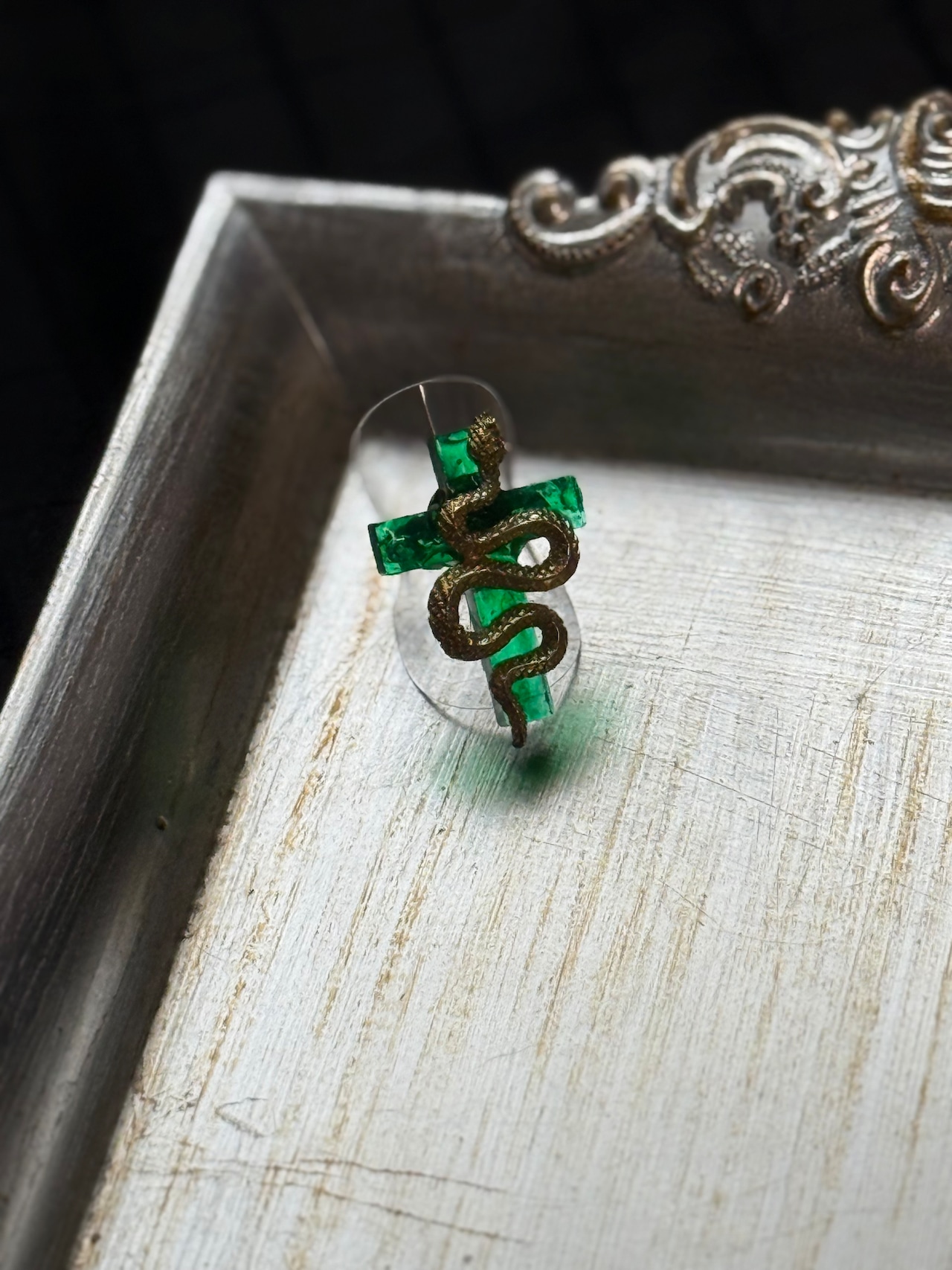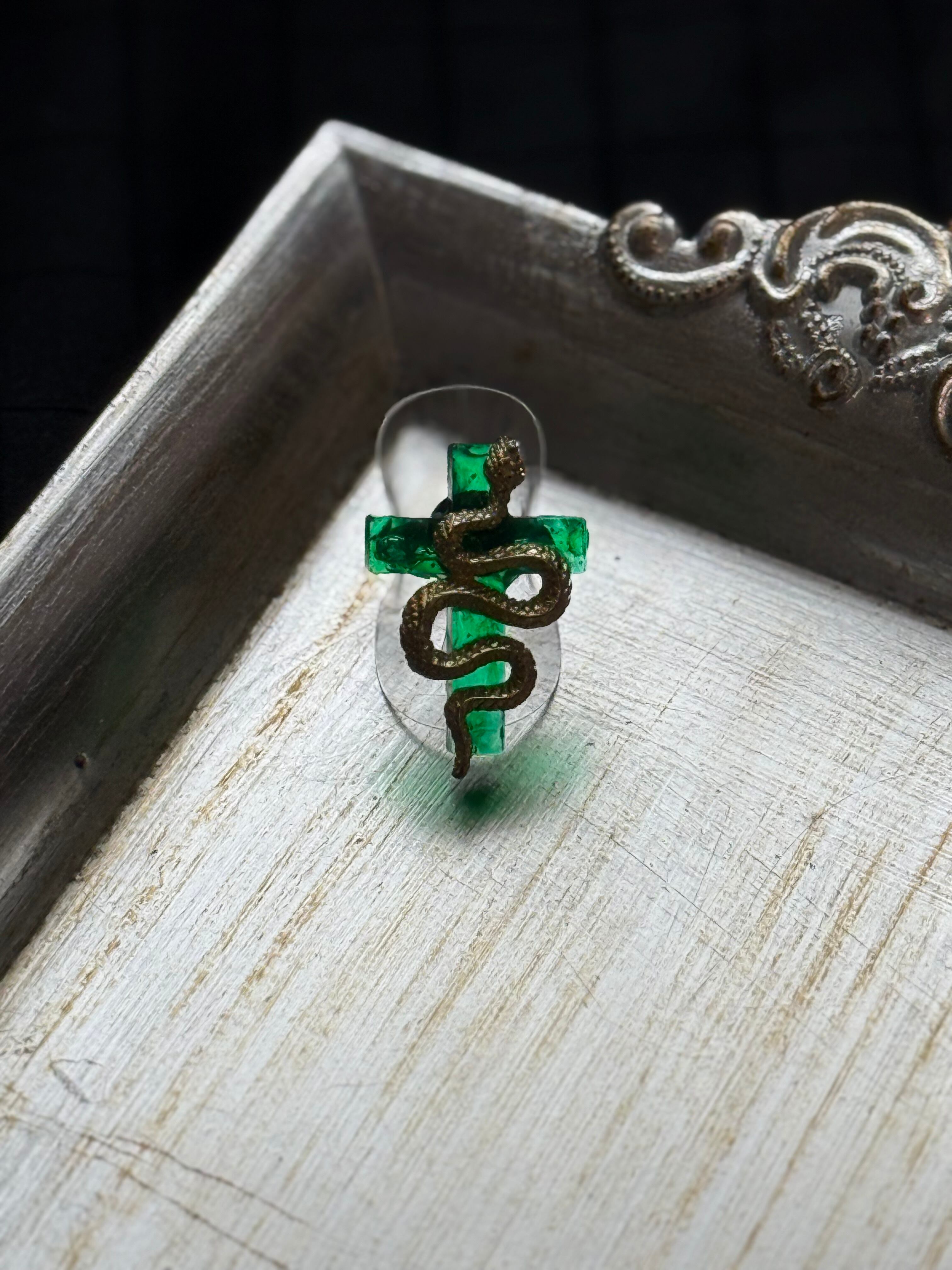 緑の十字架に蛇のリングです。